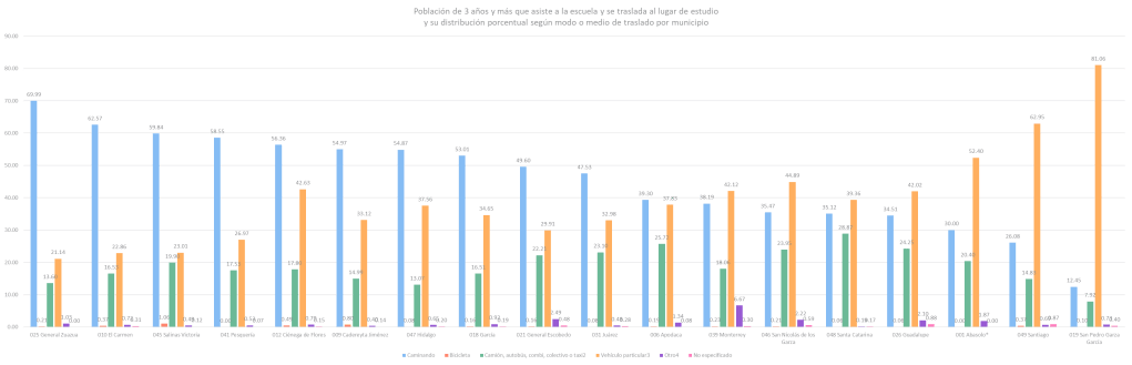 Con datos del cuestionario ampliado del Censo de Población y Vivienda 2020 a partir de información de viviendas particulares habitadas, se desagregan los viajes por motivo y medio de transporte para cada municipio. La población de 3 años y más que asiste a la escuela y se traslada al lugar de estudio se distribuye de la siguiente manera según su modo o medio de traslado por municipio.