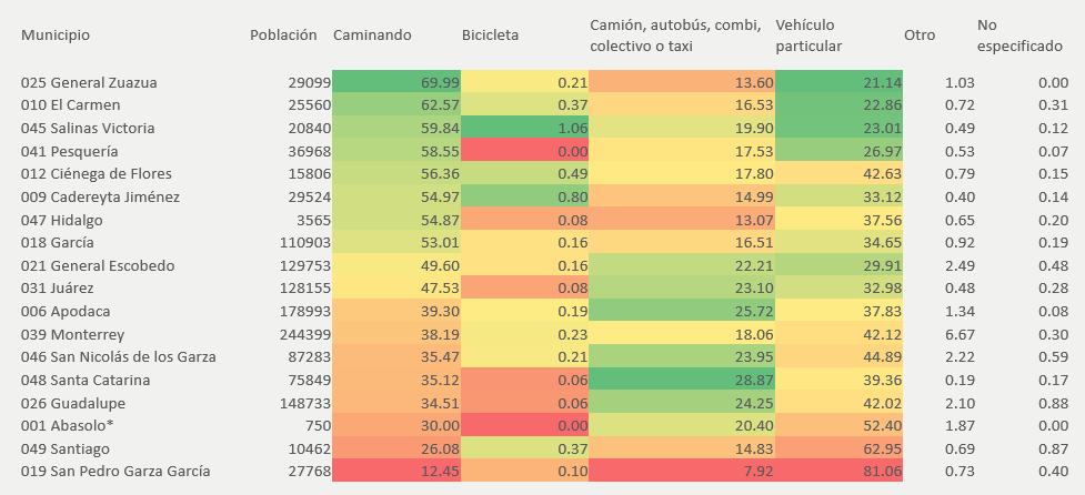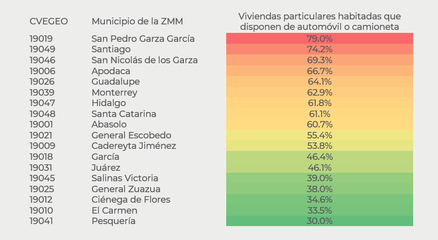 A nivel estatal, las viviendas que cuentan con un auto o camioneta representan el 58.5%, al observar solo los 18 municipios de la Zona Metropolitana de Monterrey, ese porcentaje baja a 54.3%.