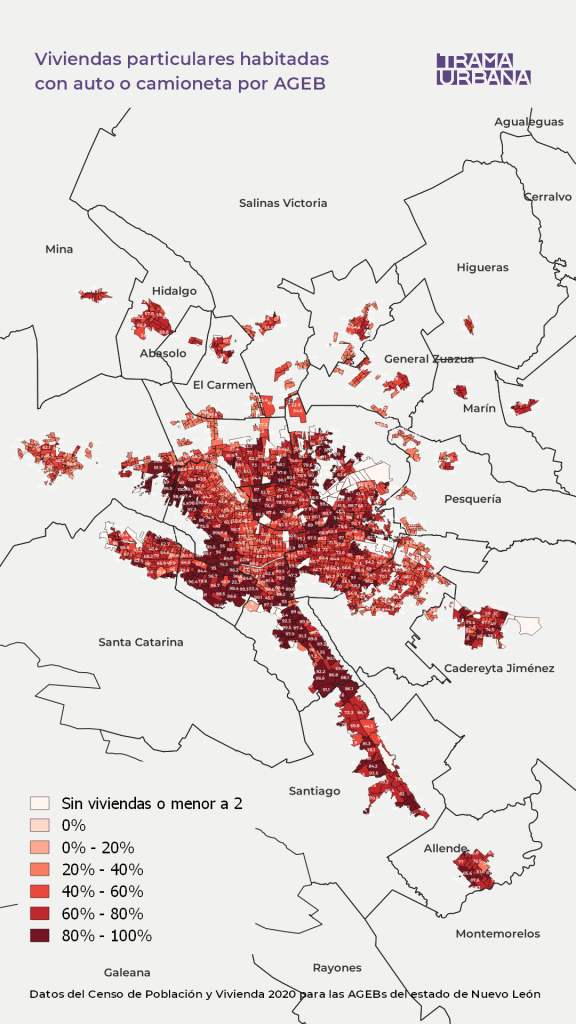 Es posible observar concentraciones tanto de alto porcentaje de viviendas con auto como el municipio de San Pedro, el sur de Monterrey, la zona de Cumbres y de bajo porcentaje de viviendas con auto como el centro y norponiente de Monterrey, algunas zonas de Guadalupe, Juárez y Escobedo.