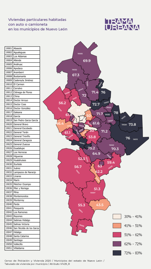 Este número es un promedio y cuando se desagrega por municipio, encontramos un rango que va del 30% de viviendas con auto en Pesquería hasta 79% de viviendas con auto en San Pedro. Y que la mitad de los municipios de la ZMM están por debajo del 60% en viviendas con auto.